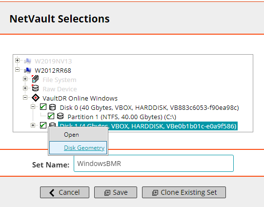 - Expand the VaultDR Online Windows plug-in to show the list of system disks and partitions. Optionally, you can click on a disk and select Disk Geometry for information about the drive.