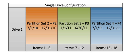 Partition set: A partition set is a group of shards that span a date range. The date range is approximately 180 days per drive. Depending upon how many drives you have configured, your partition set will consist of 1, 2, 3, or 4 shards. |