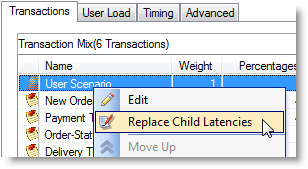 In the Transactions tab, right-click the user scenario and select Replace Child Latencies.