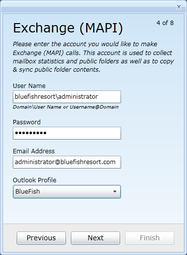 Enter the User Name, Password and Email Address for the account Migrator Pro for Exchange should use for Exchange (MAPI) calls, and select the Outlook Profile.