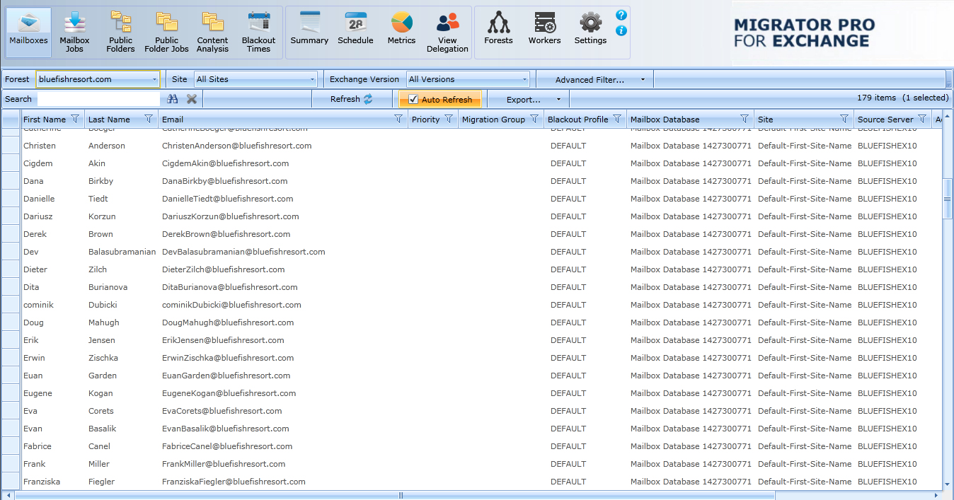 Mailboxes: Lists mailboxes from all the sites in the specified forest. In addition, it allows you to sort, group, search, and select mailboxes to add to the migration queue.