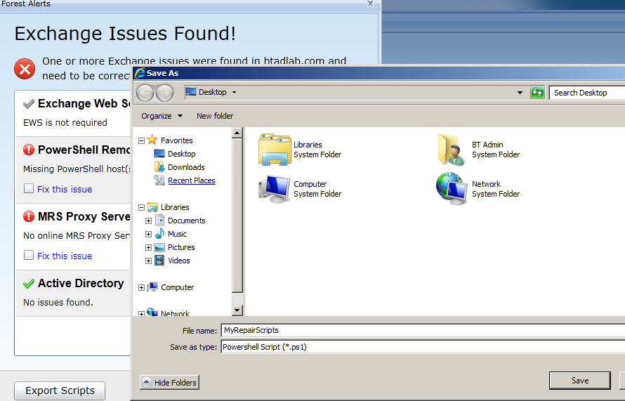 Clicking on the icon will bring up dialog boxes to help in troubleshooting. You can click the Details button for more information. This information also displays the relevant PowerShell script that is used to troubleshoot the issue.