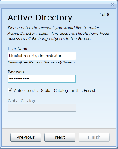 Enter the User Name and Password for the account Migrator Pro for Exchange should use for Active Directory calls, and specify the Global Catalog for this forest.