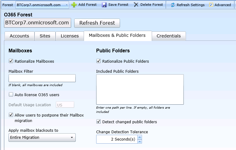 Tenant Forest (Office 365) Configuration | Mailboxes & Public Folders Tab