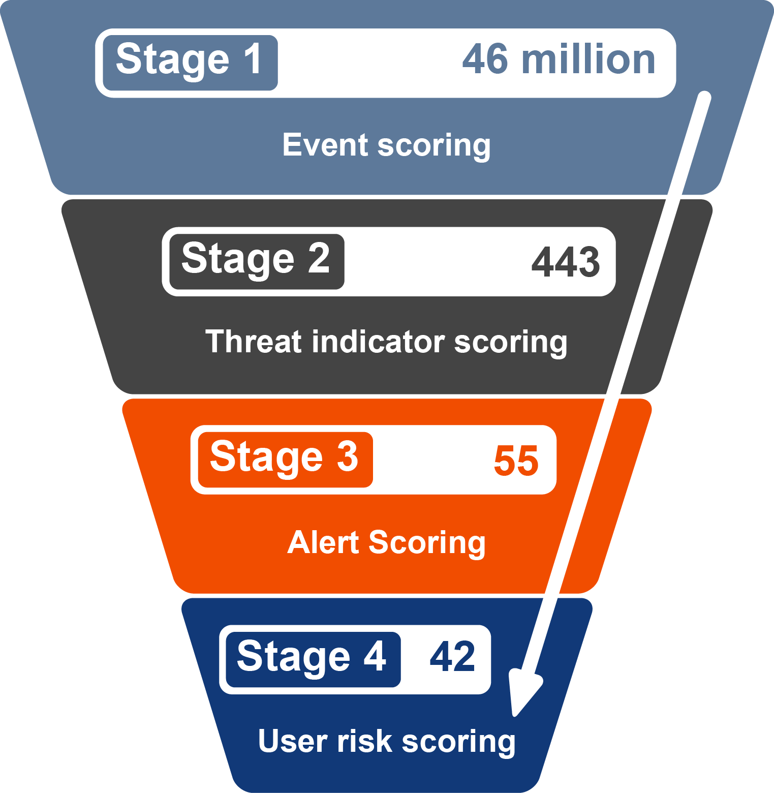 Each alert is assigned a risk score based on the criticality of its threat indicators. All the alerts that have been identified for each user are combined to produce an overall user risk score that reflects how risky or suspicious that user is. To ensure that only highly suspicious patterns of activity are highlighted and more innocuous alerts are suppressed, risk scoring is applied at four different stages.