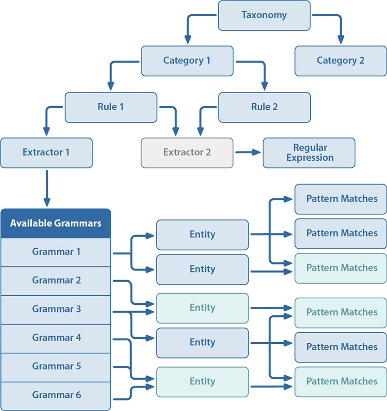 The following diagram shows the building blocks of a taxonomy, and how you can reuse extractors, grammars, entities and pattern matches: