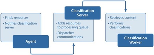 • Classification Server includes the services that manage the classification engine repository, the Gateway service, and the content service. When a Data Governance agent scans a managed host and recognizes a new resource to be classified, it pushes the data to the Classification server, which queues request to process data by the Worker Service.