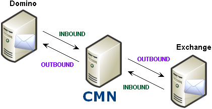 Note: The terms "Inbound" and "Outbound" as used here are relative to the Mail Connector itself, as shown in this illustration. An "Inbound" server is one from which CMN receives messages, and an "Outbound" server is one to which CMN relays messages.