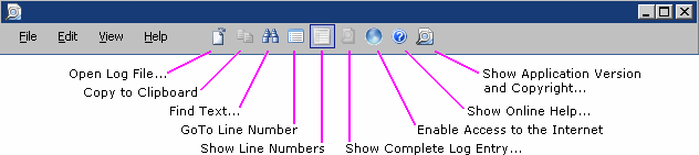 Most Log Viewer features are accessible by the program’s menus and/or the program toolbar, which share a horizontal band across the top of the screen: