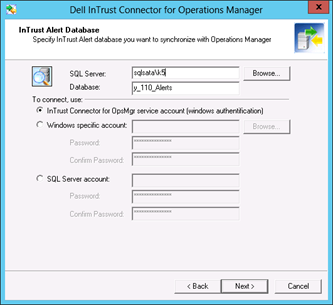 1. On the InTrust Alert Database step of the Configuration Wizard, specify the Alert database location and name, and the account that should be used for connection. You can use either the InTrust Connector service account (specified during its setup) or another account with sufficient rights (see the Software Requirements and User Rights topics).