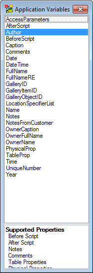 which can be found in object properties forms. When you click it, the Application Variable dialog opens and displays available variables and in which properties they are supported.