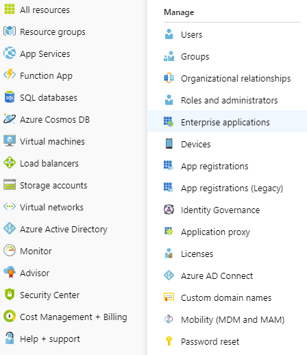 - In Azure Management Portal, navigate to the Microsoft Entra ID section in the left pane and click Enterprise applications.