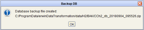 Regular DT database backups are recommended as a best practice. This can be obtained with “ToolsBackup DB”: it produces a zip file with a dump of CC DB into “C:\ProgramData\erwinDataTransformation\data\H2\BAK” folder, with backup datetime: