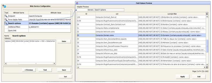4) define additional filters, i.e:. “is_deleted=0” that will be appended to previous parameters. To add “metacriteria” to complete the search options, defined in point 3), append the metacriteria search options using the GLPI syntax here: “is_deleted=0&metacriteria[0][itemtype]=Computer&metacriteria[0][field]=2&metacriteria[0][searchtype]=equal&metacriteria[0][value]=>0