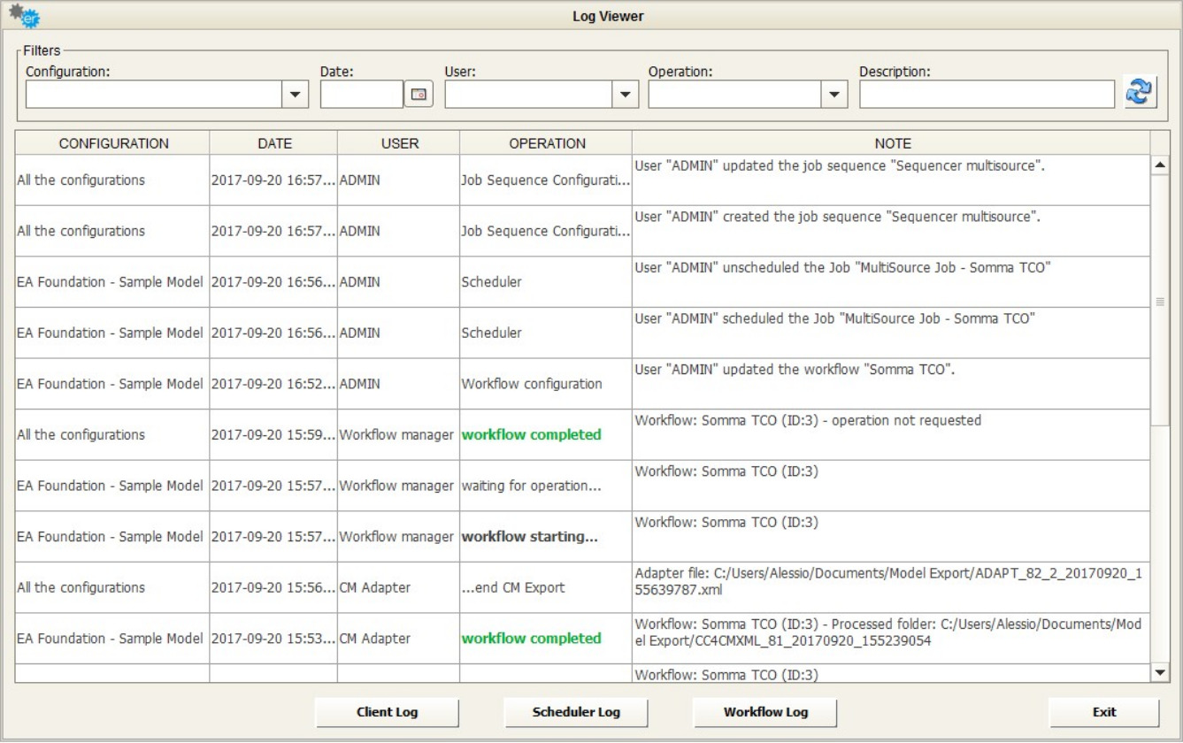 For each row, you can see the name of the configuration (column name CONFIGURATION – available only if linked to the action), the date (column name DATE – timestamp of the action), the user (column name USER – the user who owns the action), the operation (column name OPERATION – what has been done) and a short description of the action (column name DESCRIPTION).