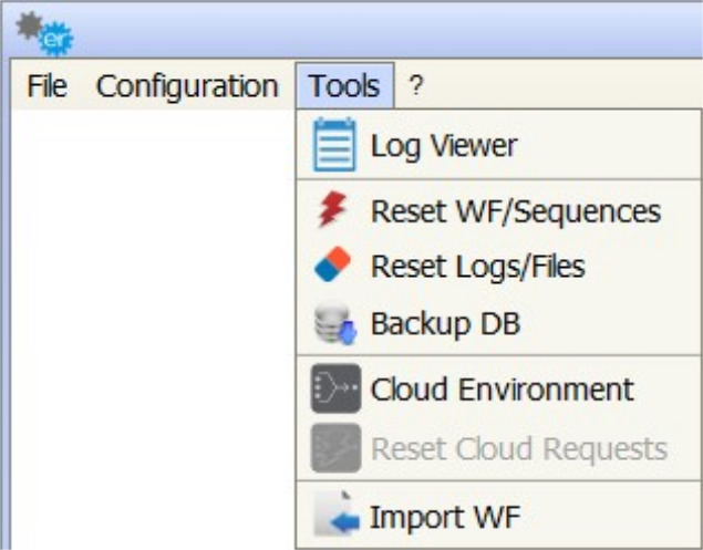 This menu provides access to the application log viewer. Additionally the user can reset sequences that are running, reset logs, delete workflow files, backup CC database and import workflow from the CC workflow export file – see Utilities