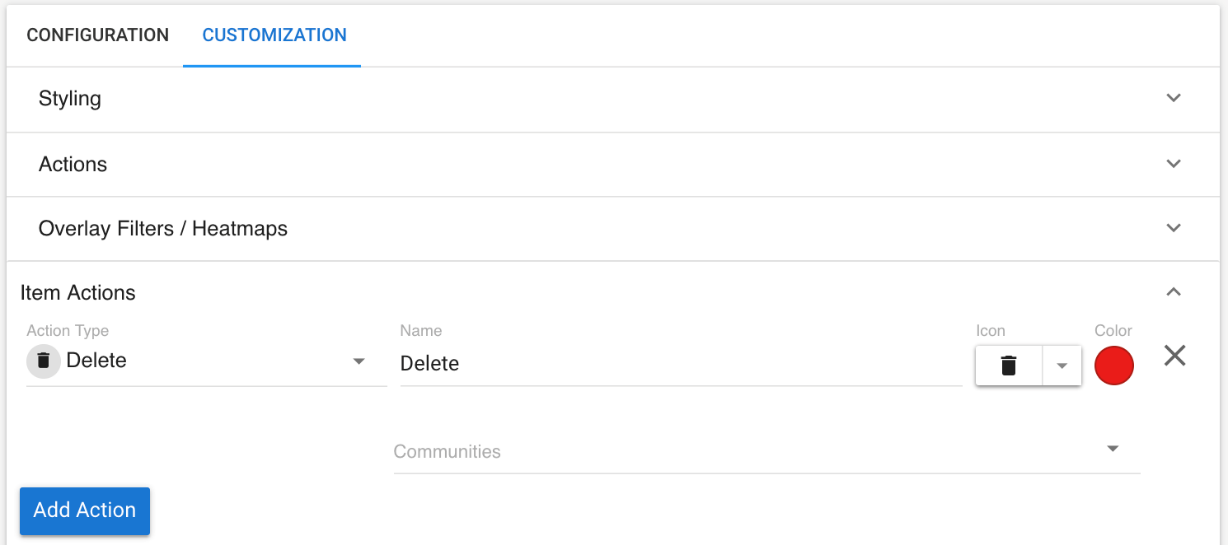 1. To add an Item Action to a View first go to the 'Customization' tab in View Configuration and open the 'Item Actions' Accordion