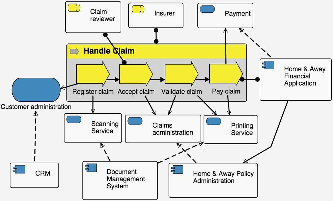 This viewpoint is useful when designing an application through identification of the required business services and processes, or in designing processes by describing the application services available to it.