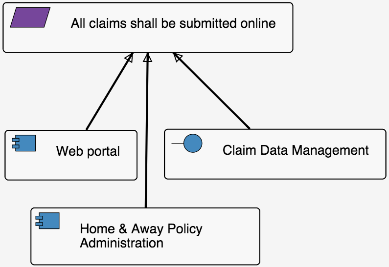The Requirements Realization viewpoint focuses on modelling the realization of requirements and constraints by means of core elements, such as actors, services, processes, and application components.