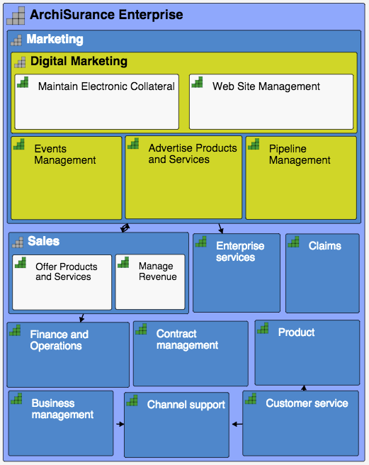 The Business Capability viewpoint is used to describe one or more business capabilities, their hierarchy, and their relationships with each other objects including inputs and outputs.