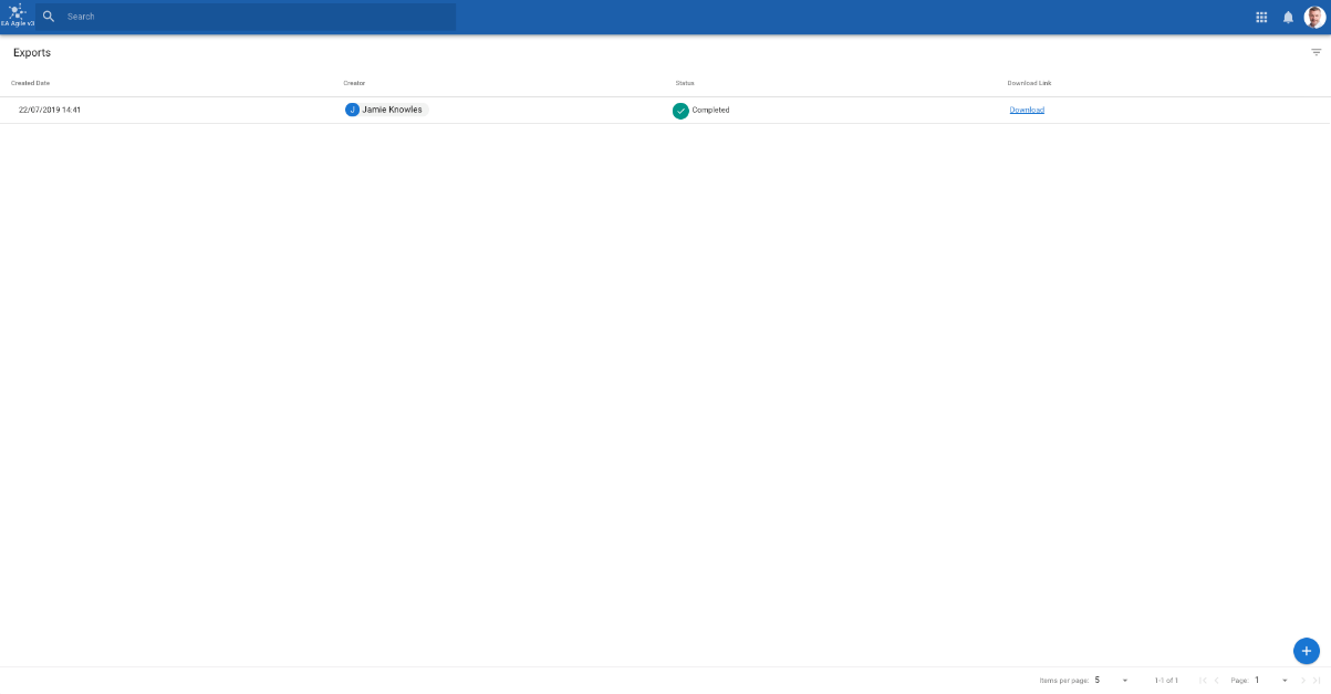 2. You will be presented with a list of all previous exports, their status, and a download link for the file. If you wish to create a new export press the blue + button in the bottom right corner.