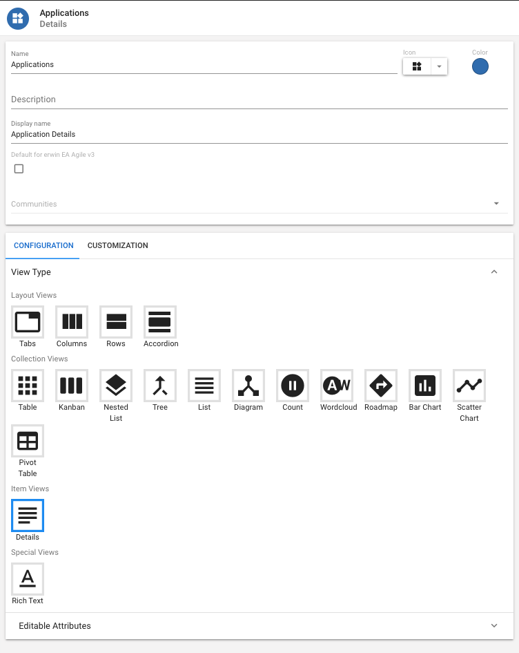A Details View allows you to display Attributes of an Object Type Instance. This type of view is commonly used for Object Type views, when first accessing the Platform you may need to edit the default view to display the Attributes you wish; this is done by creating or editing a Details View.