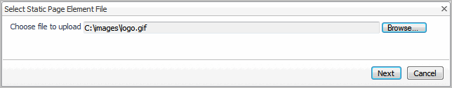 To change the resource associated with this static page element, select Upload new file. Navigate to and select the file containing the web resource you want to use.
