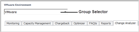 You begin this process by using the Group Selector, located in the upper left section of the VMware Environment dashboard, to select the virtual environment that you want to monitor. The Foglight Change Analyzer views display the changes made to the selected virtual environment and assess their impact on that virtual environment.