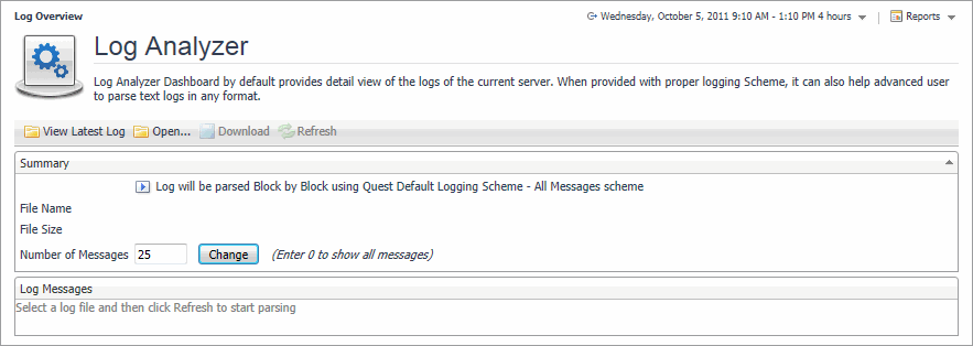 Use the Log Analyzer dashboard to view the contents of any types of log files, or download log files to a desired location. The time, level, source, and description of log messages appear for each log you view using this dashboard.