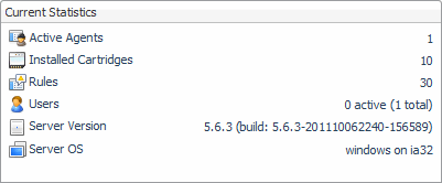 The Current Statistics view contains information about the installed cartridges, active agents, rules, users, and the Foglight Management Server configuration.