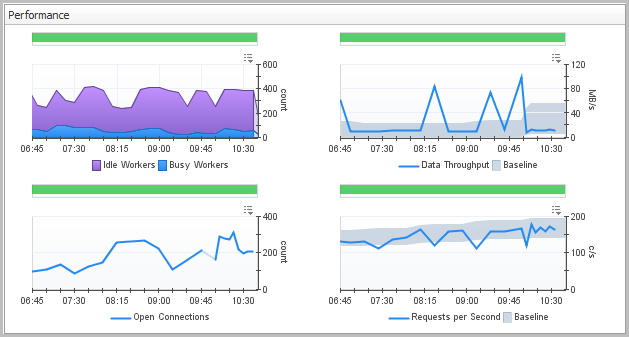The Performance charts on the Performance tab provide an at-a-glance overview of four key web server metrics and their overall health: idle/busy workers, data throughput, open connections, and requests per second.