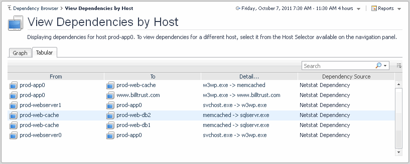 Use the View Dependencies by Host dashboard to look at the relationship between a selected host and other components in your environment. It contains the following tabs: