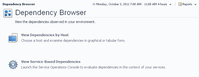 To start the Service Operations Console for evaluating the dependencies in the context of a service, in the Dependency Browser dashboard, click View Service-Based Dependencies. Alternatively, you can access this dashboard by clicking Services > Service Operations Console in the navigation panel.