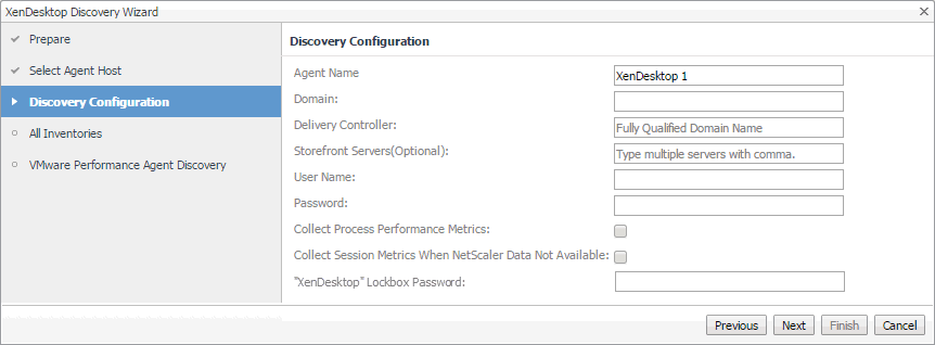 NOTE: Unlike the Create XenDesktop Agent wizard, the Discover XenDesktop Wizard offers to create VMware Performance agents for the detected vCenters, or Windows or Unix agents for the discovered servers, in addition to creating a XenDesktop Agent instance. For more information about the Create XenDesktop Agent wizard, see Creating XenDesktop Agent instances .