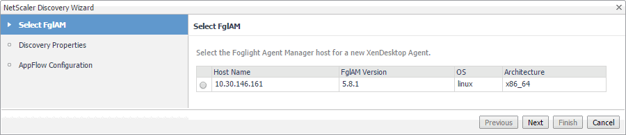 In the NetScaler Discovery Wizard, on the Select FglAM page, select the host running the Agent Manager that you want to use to manage the agent instance you are about to create, and click Next.