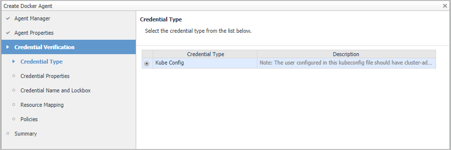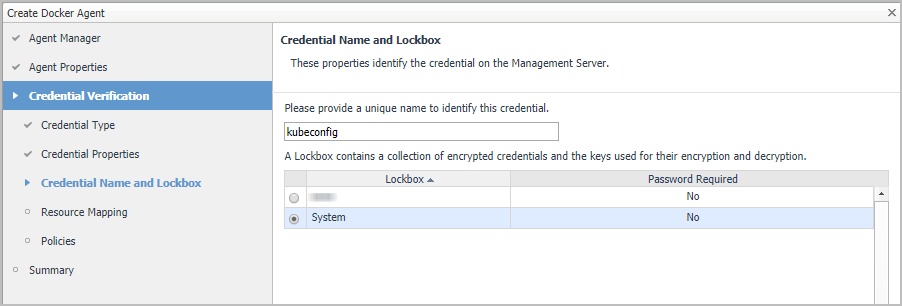 NOTE: If an existing credential is detected, the screen will prompt, “An existing credential has been detected for this resource and the lockbox won’t be released to the selected Agent manager. To continue the Agent creation steps, manually release the lockbox. Ignore this message if the lockbox has been released and click 'Next' to continue.”.
