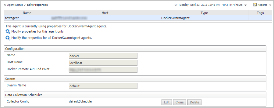 On the Agents table, select the Docker Swarm Agent that you create, click Edit Properties, and then click Modify the private properties for this agent.