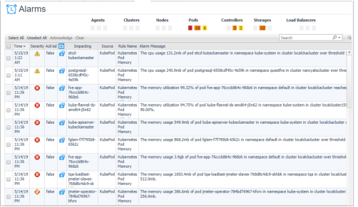 The Alarms dashboard displays a list of alarms generated against the monitored Kubernetes environment. Use this view to quickly identify any potential problems related to a specific Kubernetes component.