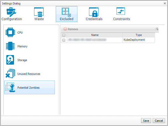 To remove resources from the list of Excluded objects, select the check boxes for these resources and click Remove. To save any changes made to the Excluded settings, click Save at the bottom of the tab.