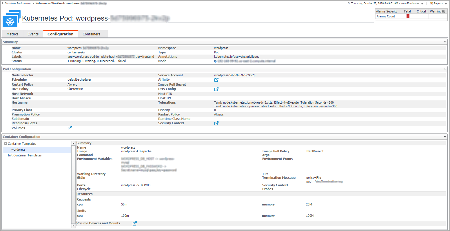 Alarms: Displays the alarms aggregated from the pod and the current workload related to the pod.