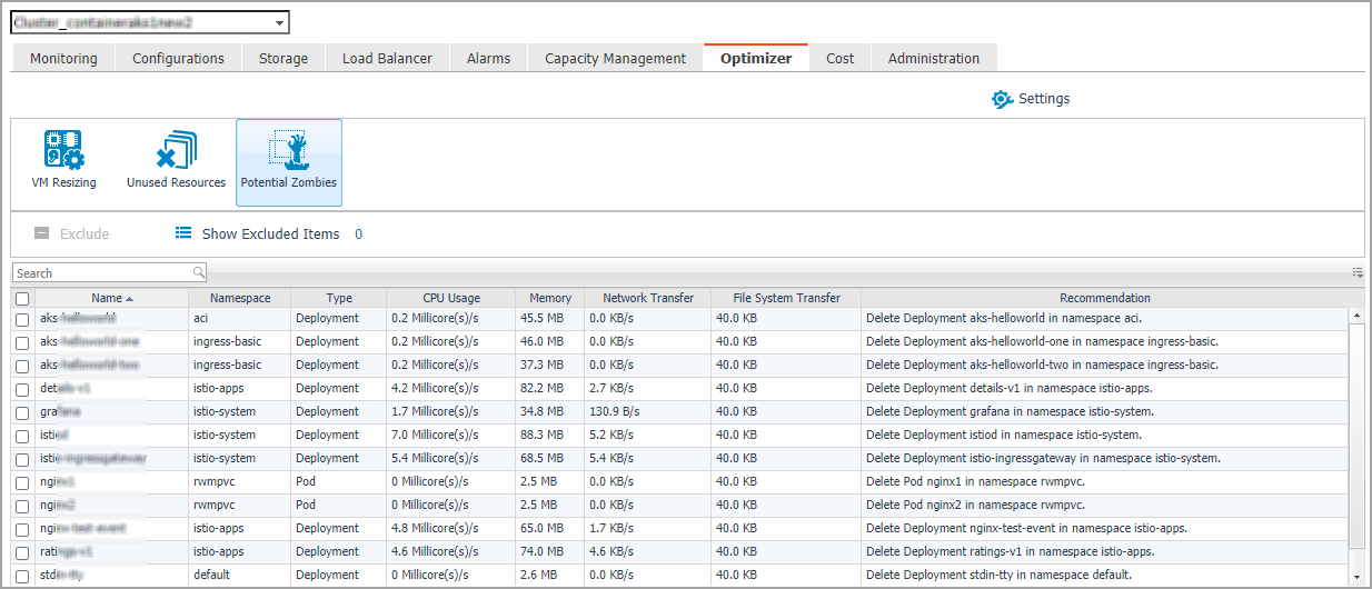 Unused Resources table. Detects and shows those unused resources in container environment.