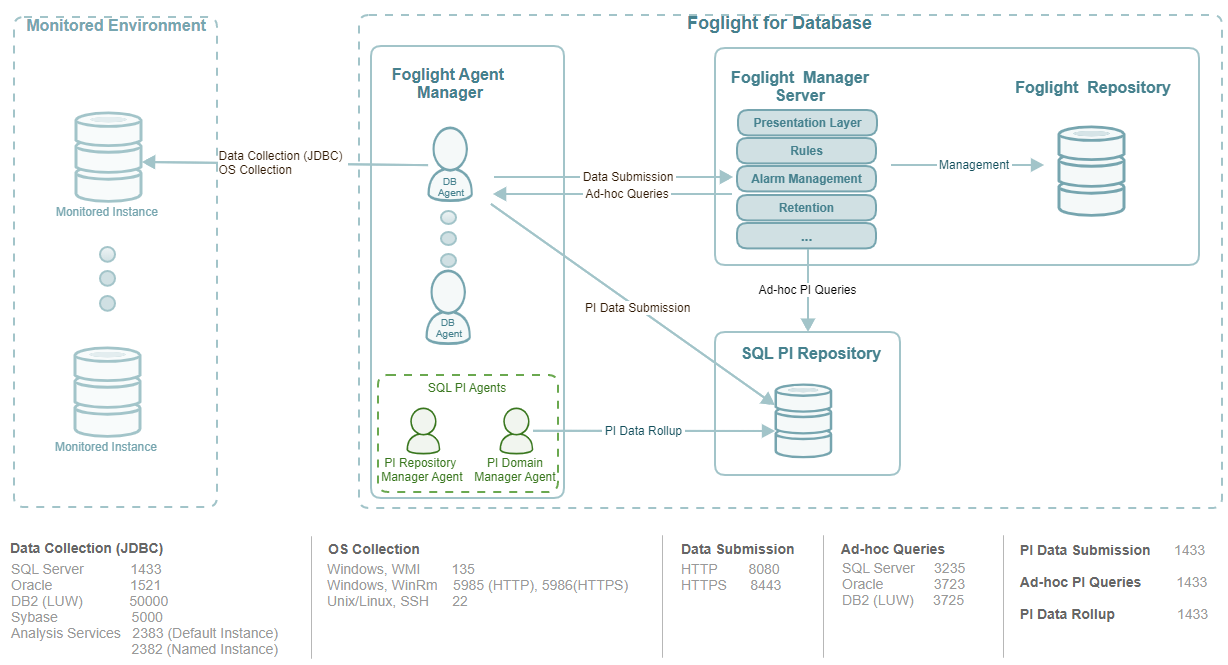 Foglight Management Server and Foglight Repository — Responsible for managing, alerting, and viewing the collected data. Both components can be set to run on the same machine or reside on separate machines.