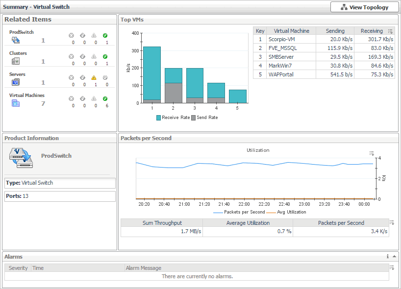 The Virtual Switch Topology View visualizes the relationships between the objects in your environment through an interactive map. The map illustrates how different components relate to each other, and the levels of the available resources available to them.