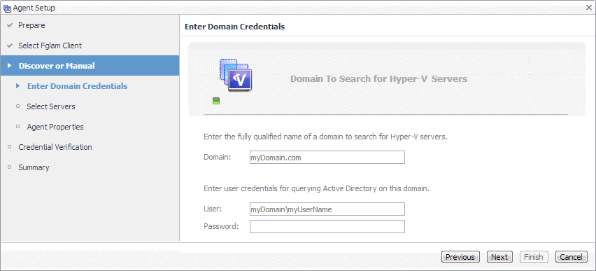 Discovering Hyper-V Servers only. On the Enter Domain Credentials page that appears, specify the information needed to search for the running Hyper-V Servers.