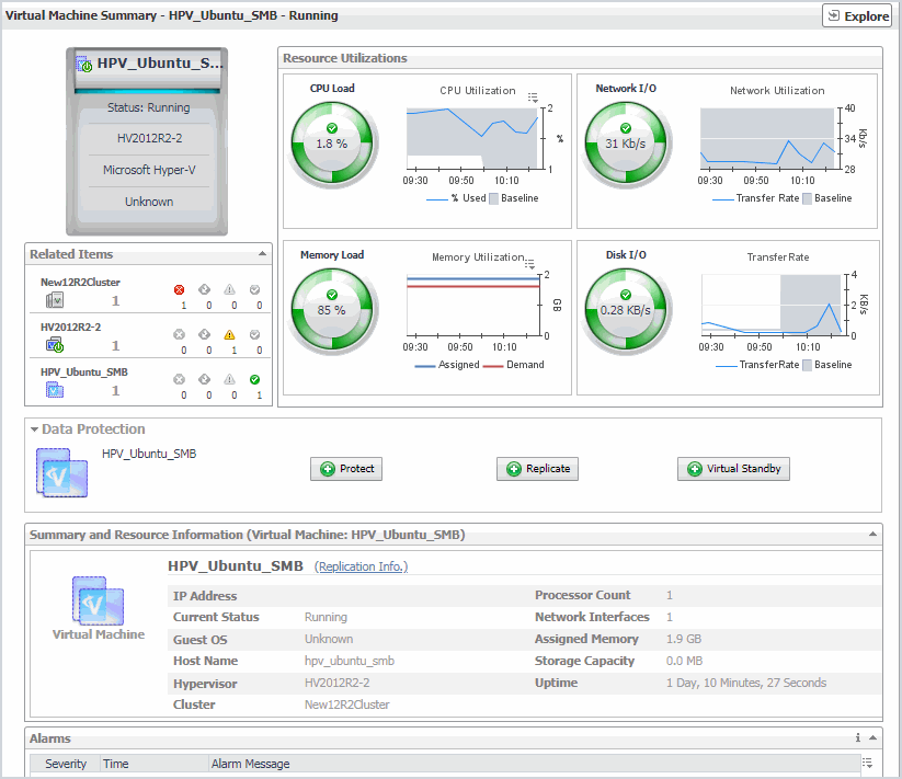 Shows the resource consumption for the selected virtual machine, broken down into four simple views. | |||