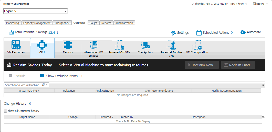 With virtual machines quickly becoming the industry standard in an IT infrastructures, making it necessary to plan for the addition of virtual machines to the physical hosts. This is often a challenge for administrators. Foglight™ Resource Optimizer simplifies the optimization process, providing waste-finding and right-sizing functionality for virtualized environments. The Optimizer tab available on the Hyper-V Environment dashboard allows you to get insight into capacity bottlenecks and management. Use this tab when you want to optimize the CPU, memory, network, and storage consumption, and to project and plan for additional requirements in your environment.