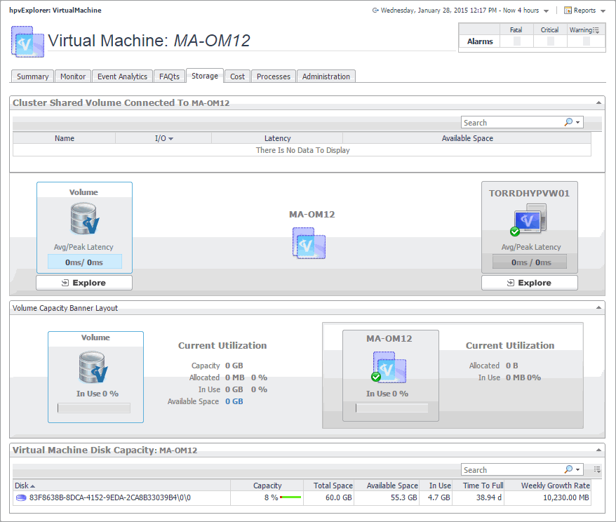 The Hyper-V Explorer Storage tab displays combination of embedded views displaying disk volumes associated with the selected cluster. It identifies the virtual machines that spend the highest amounts of disk resources. Use this tab to find out more about the overall consumption of disk resources for a given cluster. The information provided on this tab can help you prevent potential bottlenecks by reallocating disk resources where they are most needed.