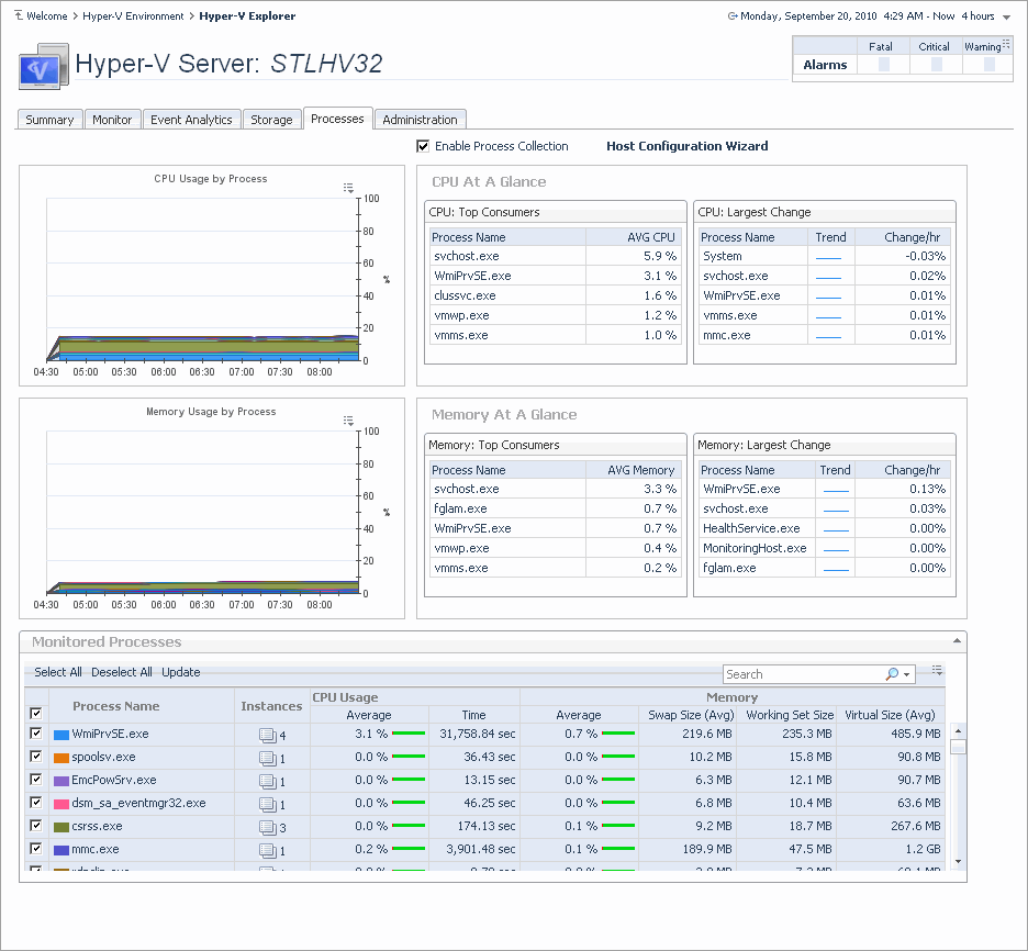 This tab only appears when you are exploring individual servers and virtual machines, and have Foglight for Infrastructure installed. It displays an organized view of process information gathered by Foglight for Infrastructure agents from a virtual or physical machine configured to send process information. When you open this tab, the process information for the selected server or virtual machine appears, allowing you to view the current CPU, memory, and monitored process statistics.