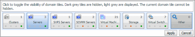 This view appears in the upper part of the Monitoring tab, just above the Quick-View. It displays a high-level overview of the selected virtual environment. The view has a tile for each type of object in your virtual infrastructure: Clusters, Servers, SCVMM Servers, SOFS Servers, Virtual Machines, Storage, and Virtual Switches.