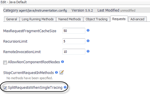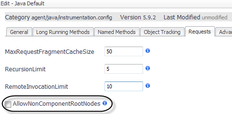 By default, the Java EE agent collects requests that start at a defined component technology (such as HTTP, JMS, RMI, EJB, or Servlet) or a custom component. Enable the AllowNonComponentRootNodes setting to allow the Java EE agent to collect information on requests that start at any method. This may be useful when using the X-Agent or the StopCurrentRequestInMethods configuration setting. For more information, see Separating requests by parent method.